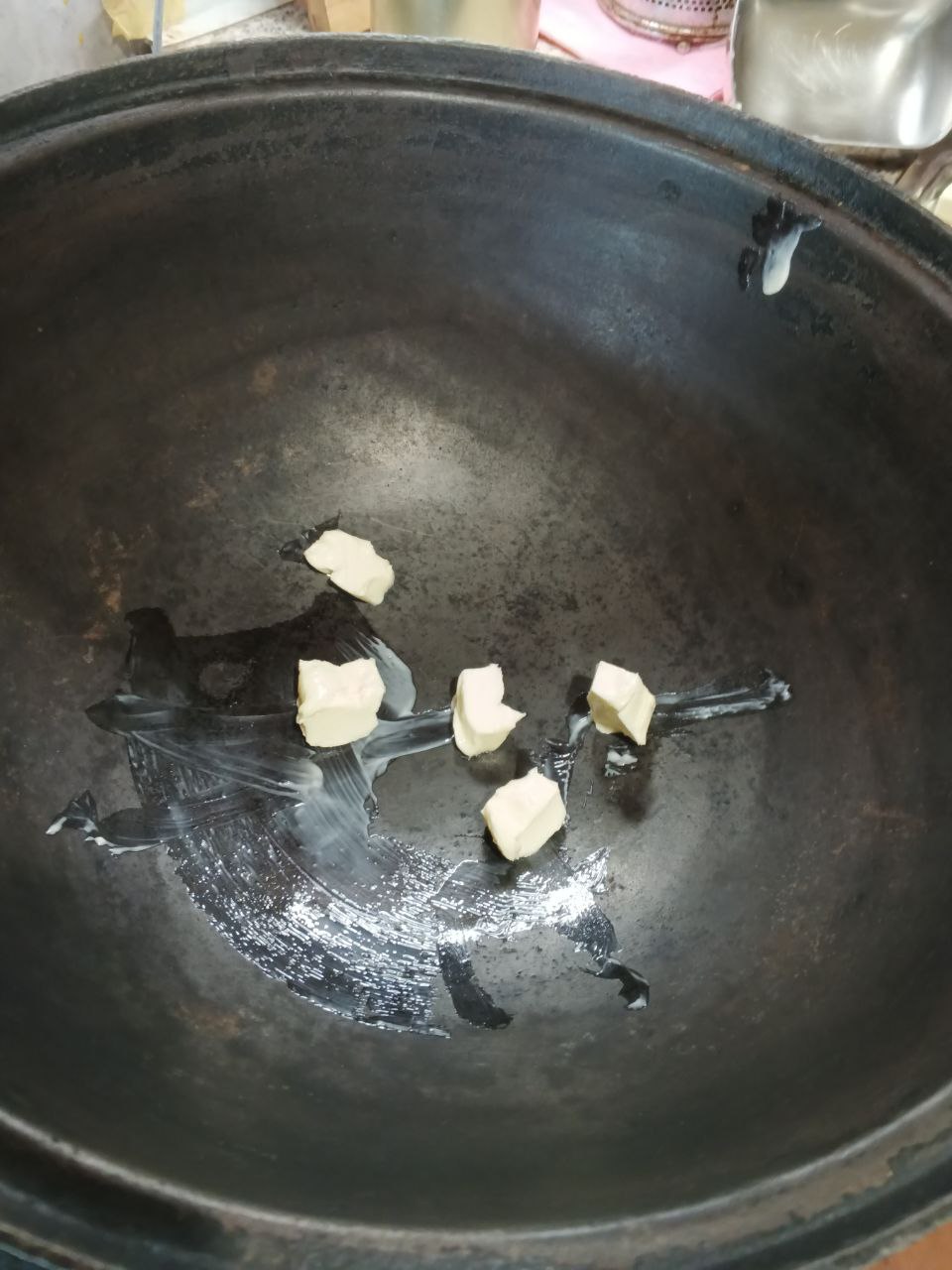 В казан,на дно, кладём сливочное масло