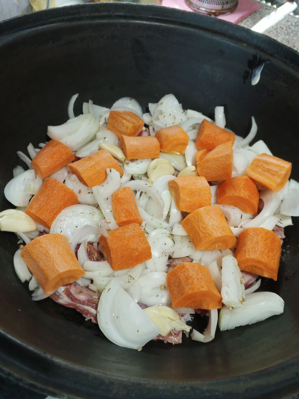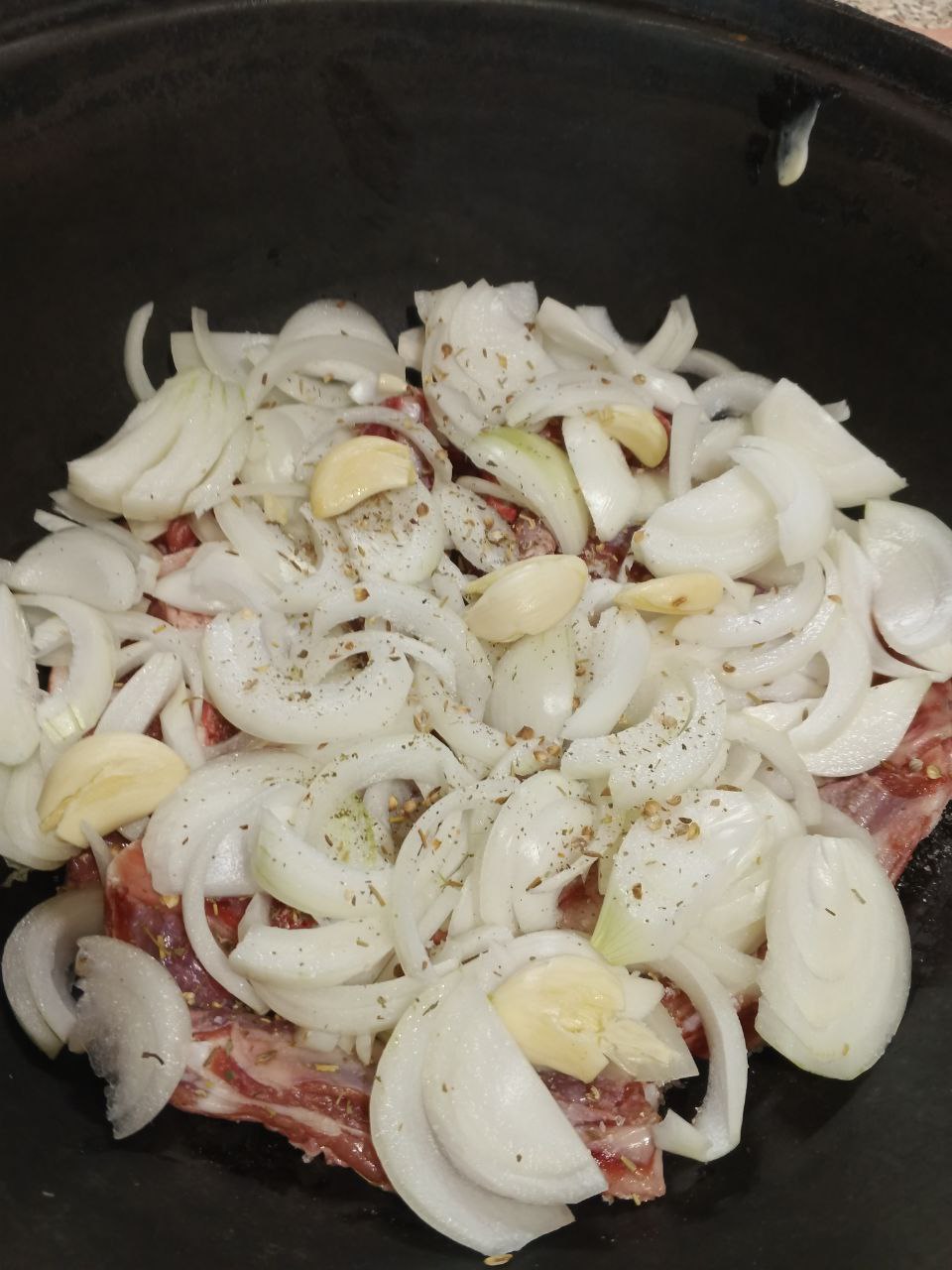 На мясо выкладываем нарезанныый лук и чеснок ,присаливаем, опять добавляем часть специй