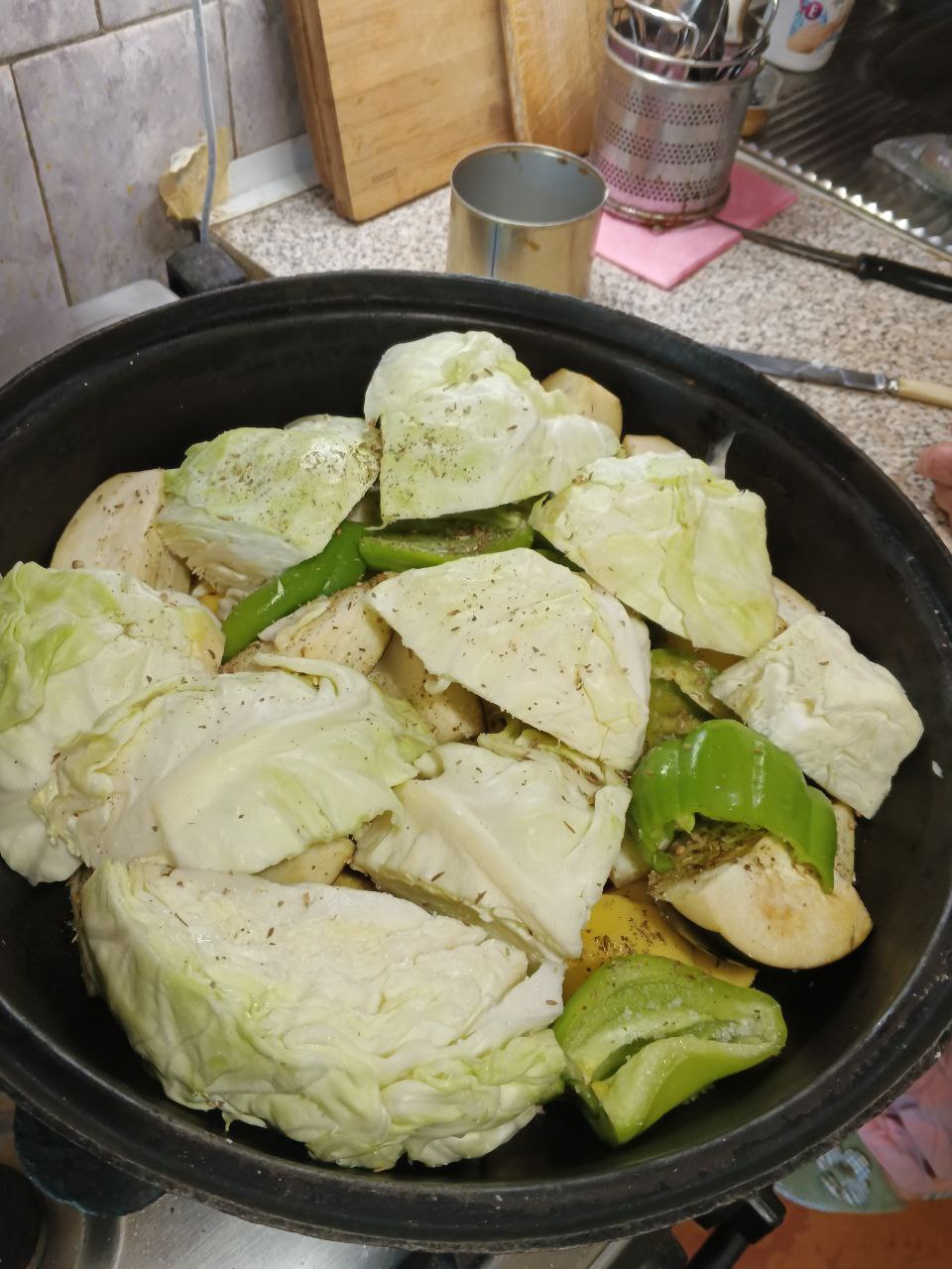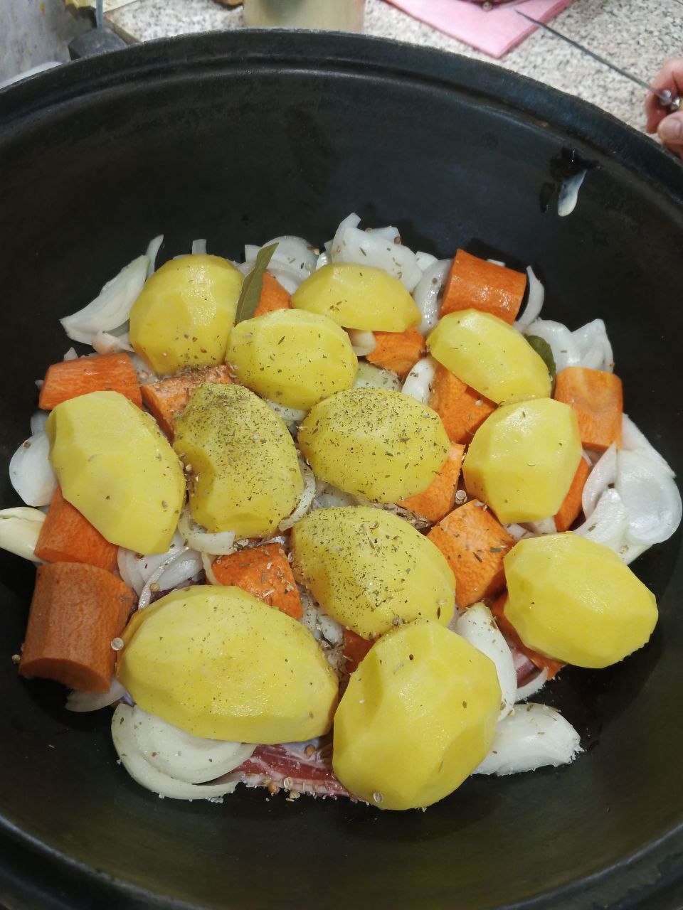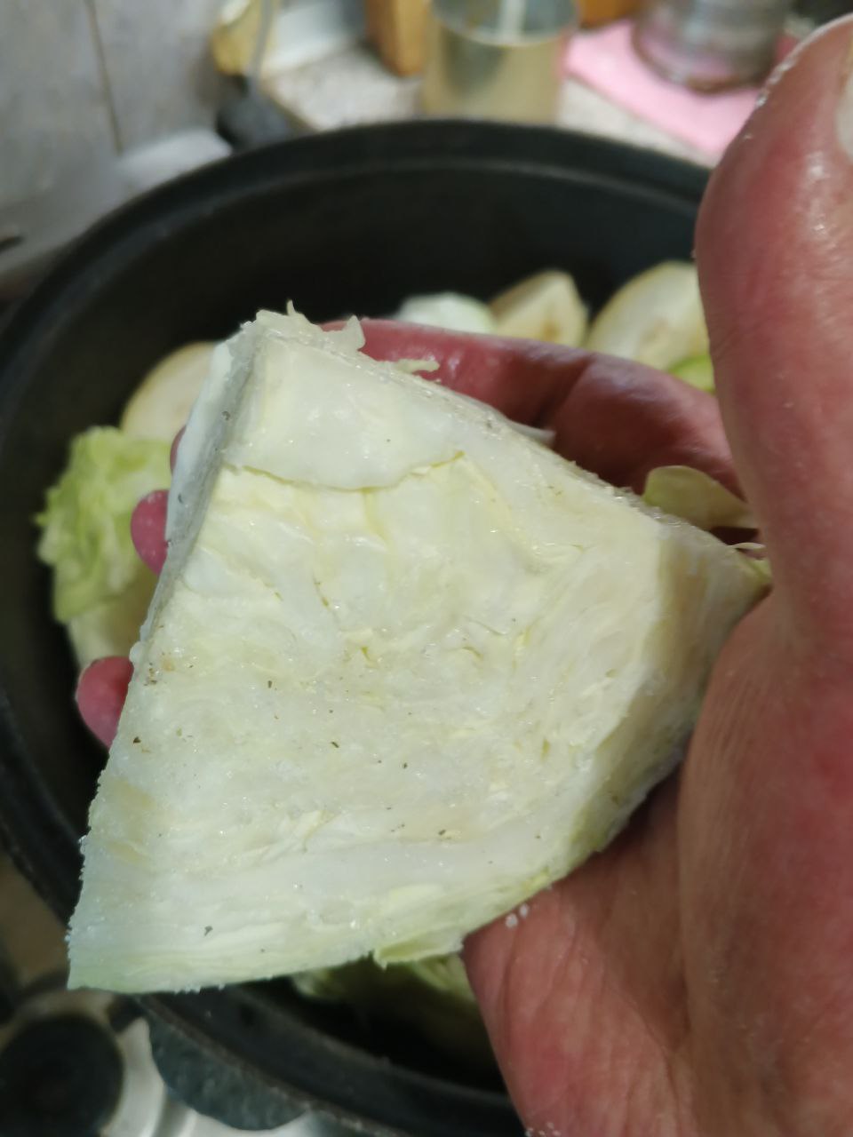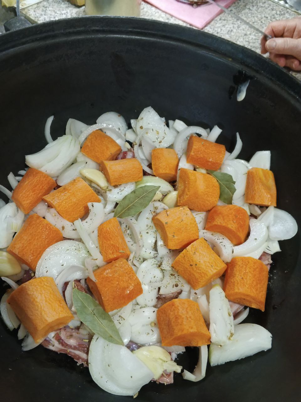 Очень крупно нарезаем капусту , присаливаем каждый кусок и выкладываем следующим слоем в казан