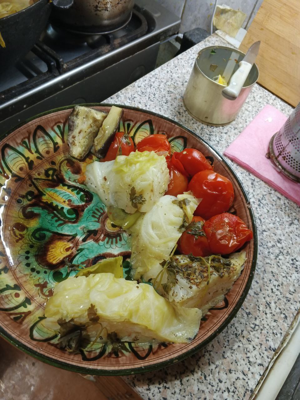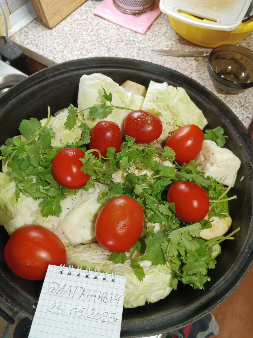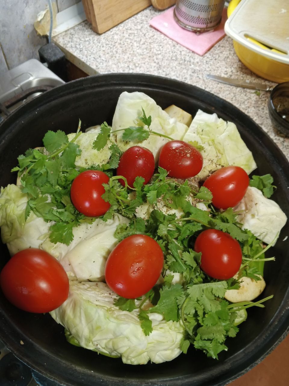 Затем вилкой или ножом делаем дырки в помидорах и выкладываем последним слоем на каппусту и зелень