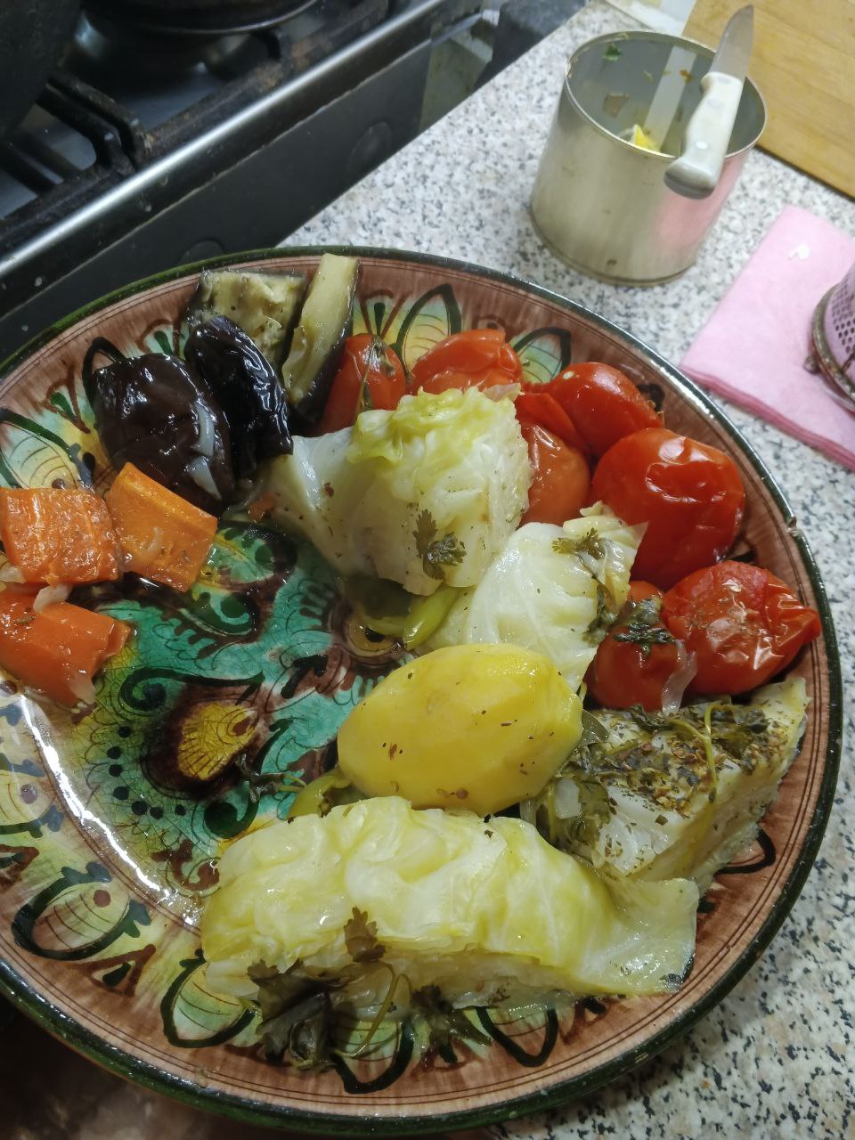 Вытаскиваем аккуратно на ляган , отдельными "кучками" все овощи , посередине или рядом выкладываем мясо