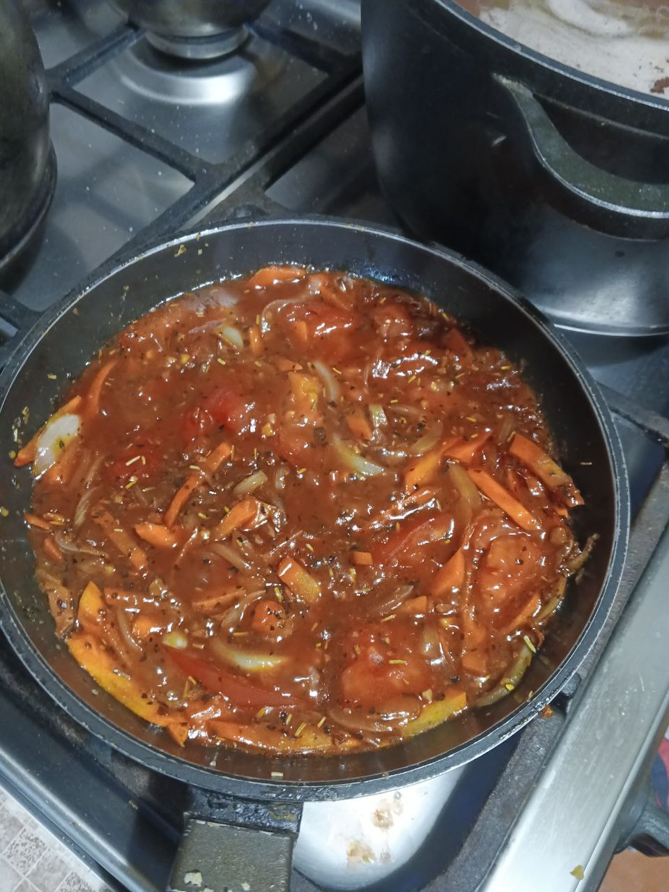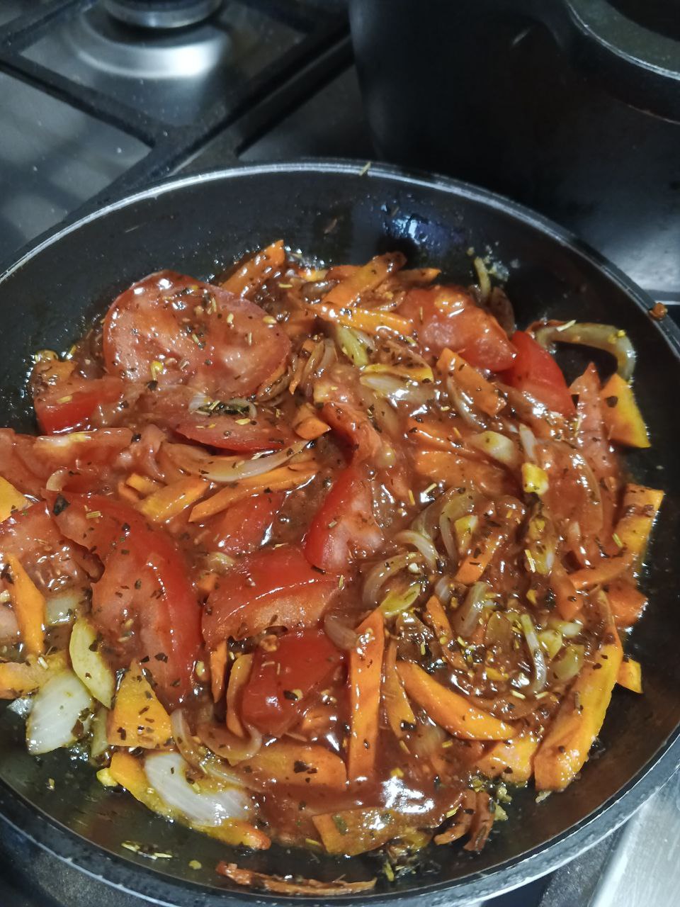 Немного протушив, добавляем кетчуп и оставляем тушиться