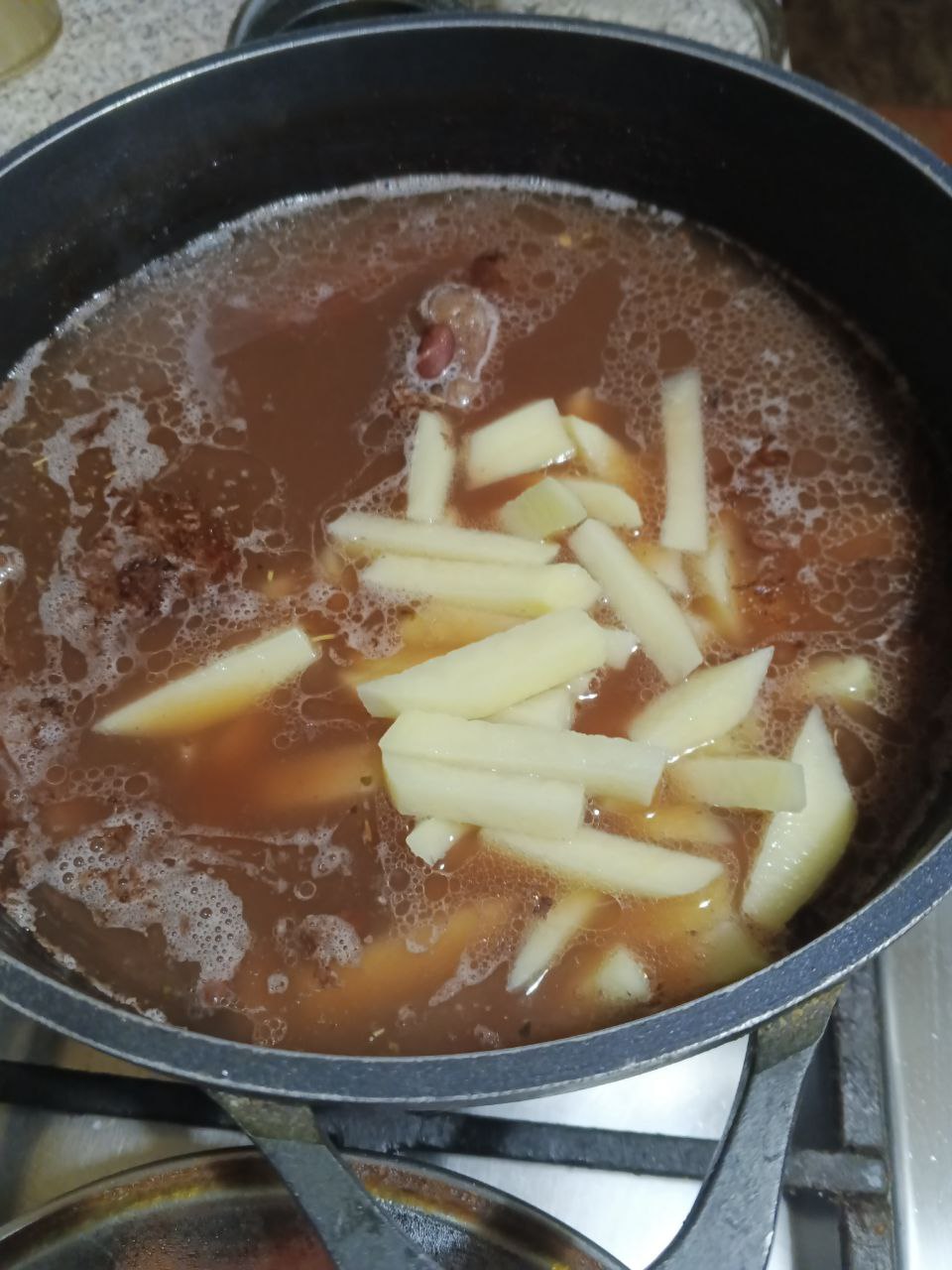 Теперь добавляем в бульон нарезанный картофель