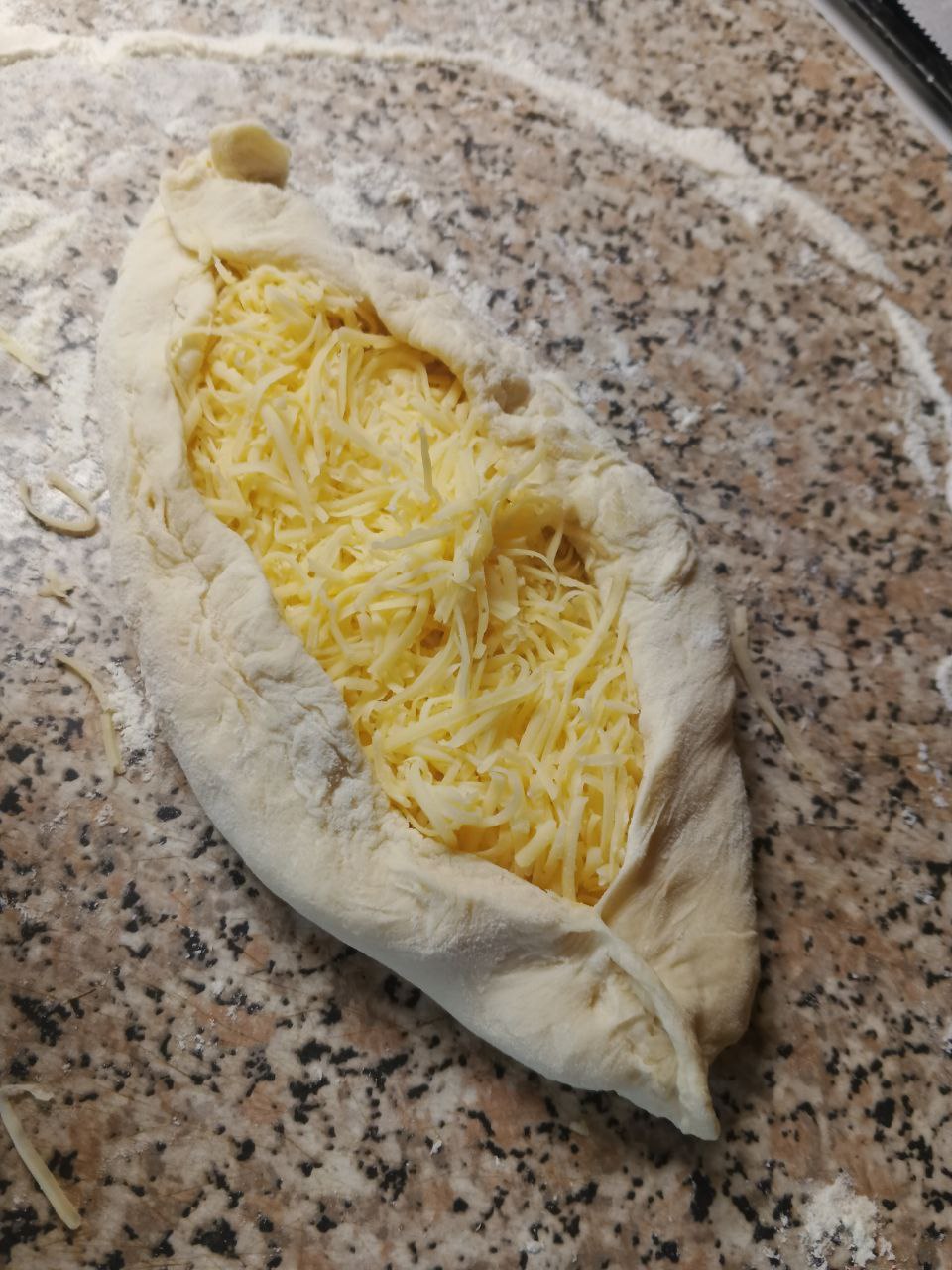 Насыпаем в "лодочку" тертый сыр и распределяем по всей поверхности , по бокам "лодочки" укрепляем стенки