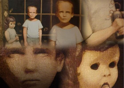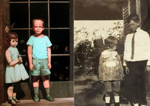 Приглядевшись пристальнее, можно заметить самый страшный фрагмент изображения — руки, которые отпечатались по обратную сторону стекла прямо за мальчиком и девочкой-куклой. Все эти детали, собранные воедино, создают гнетущее впечатление.