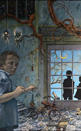 На этот раз мы видим часть первой картины, но под другим ракурсом. Вместе с мальчиком в синей рубашке мы находимся по другую сторону оконного стекла, за которым виднеются силуэты ребенка и куклы с картины «Руки противятся ему».