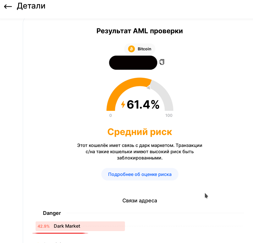 Пока выводил биткоин из одной известной биржи - получил aml средний риск 60% (dark market 25.1%)