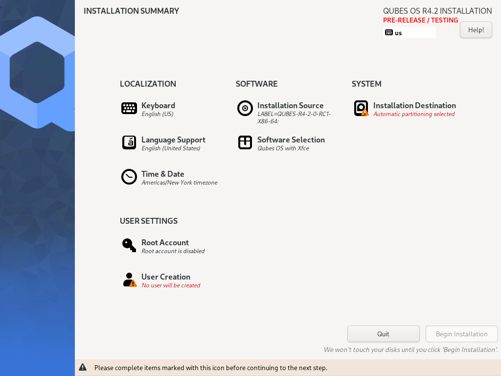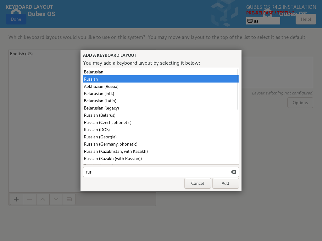 (выбираем "This is the latest stable Qubes OS release. We recommend this release for all new and existing users.", но в примере я буду использовать последний тестовый релиз). Скачиваем, записываем образ на флешку и загружаемся с флешки.При первом запуске видим стандартный установщик Anaconda, на начальном экране выбираем английский язык