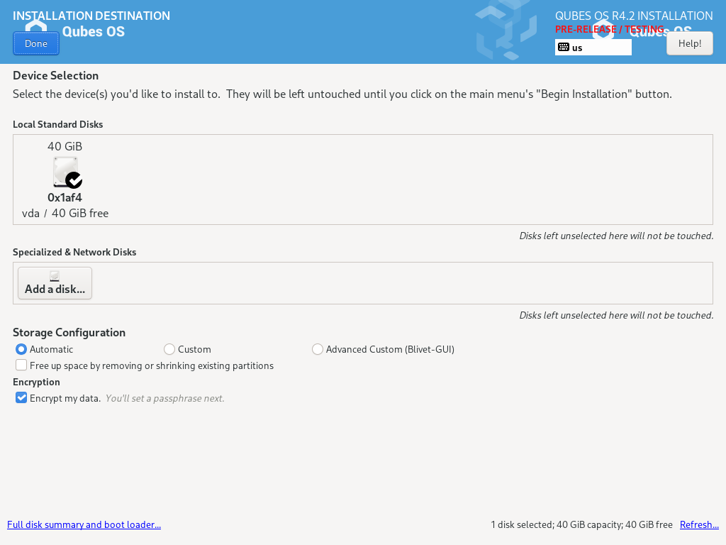 В пункте "Installation Destination" выбираем диск для установки, смотрим, чтобы стояла галочка "Encrypt my data." (более опытным пользователям рекомендую самостоятельно разметить диск и использовать файловую систему BTRFS, новичкам лучше оставить "Automatic"), после нажатия "Done" вводим пароль шифрования