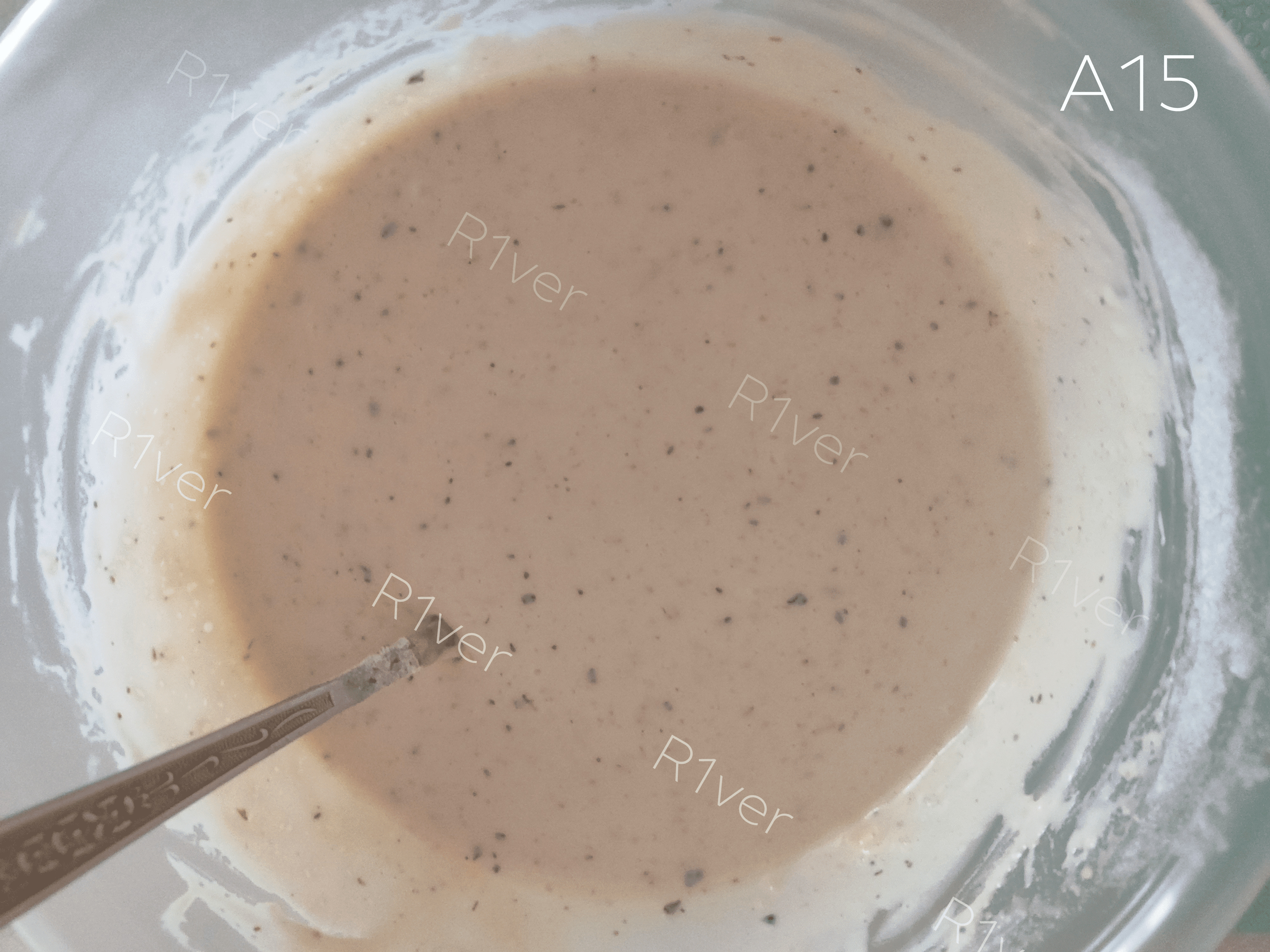 6) Соединяем наши две смеси (канна-мука с солью\сахаром и разрыхлителем и йогуртно-масляное буйство с добавлением яйца, см. фото а13). Добавляем секретный ингредиент в виде 50 мл какого-либо сока (в моем случае – вишня, см. фото а14). И опять-таки, взбиваем до однородности, см. фото а15, а16. Важно соблюсти правильную консистенцию нашей чудодейственной массы. Не слишком жидкая, но и не очень густая (да, спасибо мне за столь точное определение). Плотность сией массы должны быть такая, чтобы она была самостоятельно стекать с миски при ее наклоне.