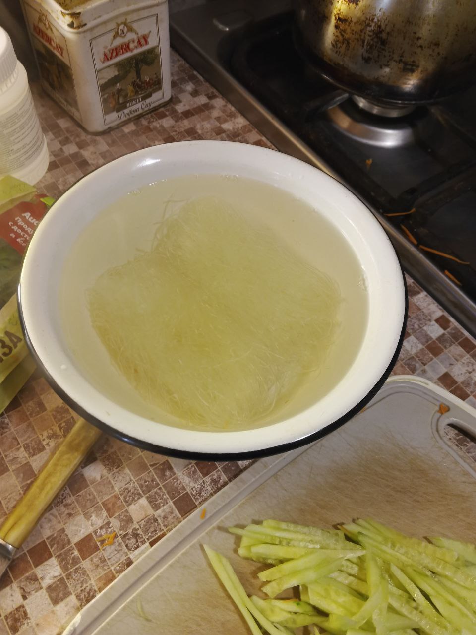 В это время - можно залить на 5-7 минут кипятком лапшу "Фунчоза"