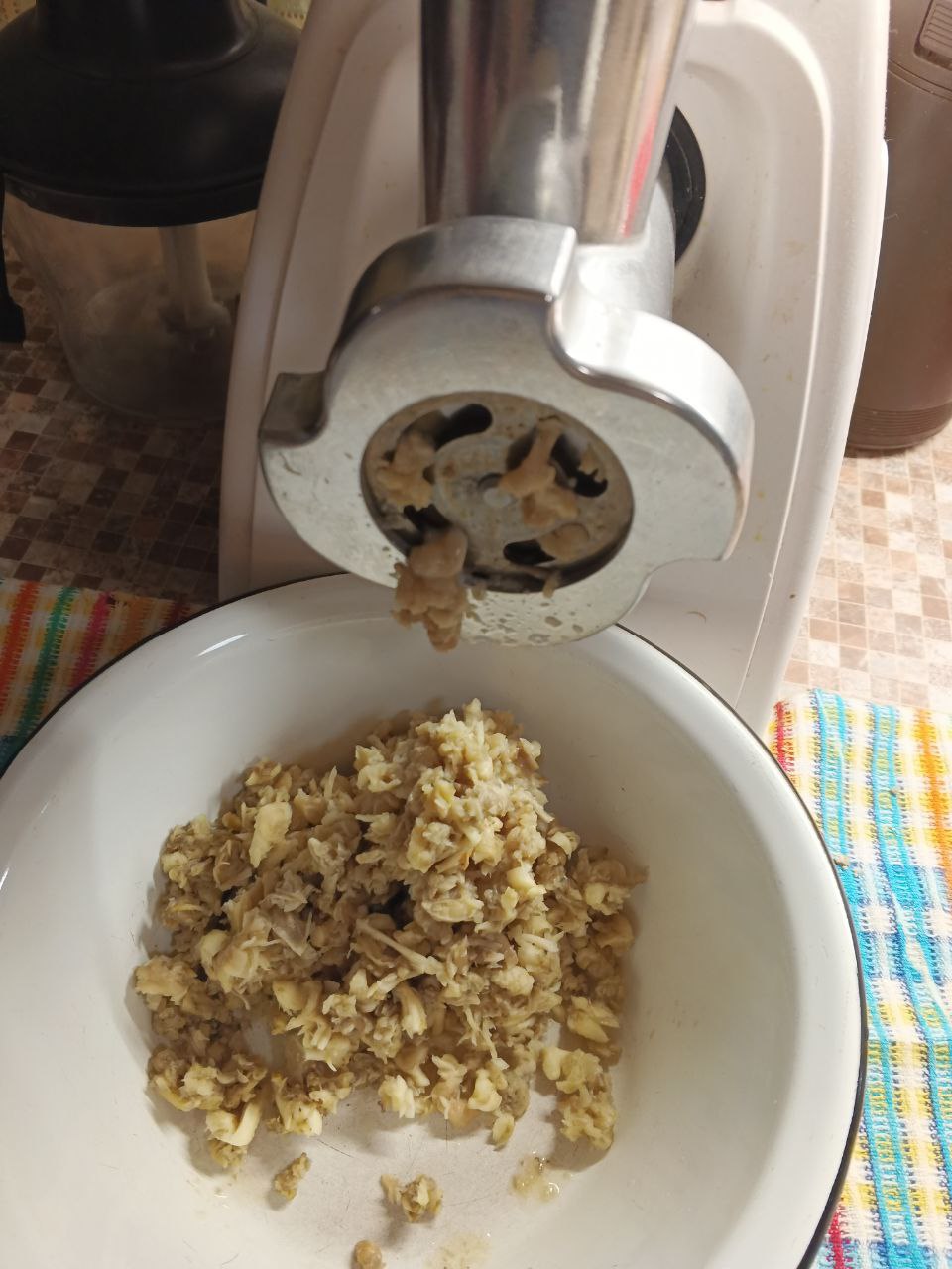 Вешенки пропукаем через мясорубку на средне-крупной решётке