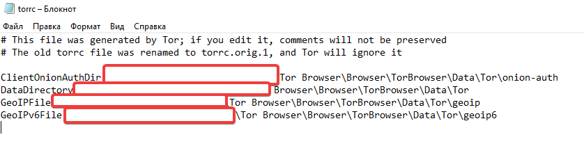 Ищем необходимый нам файл с названием "torrc":Открываем его с помощью блокнота и видим такой вот текст: