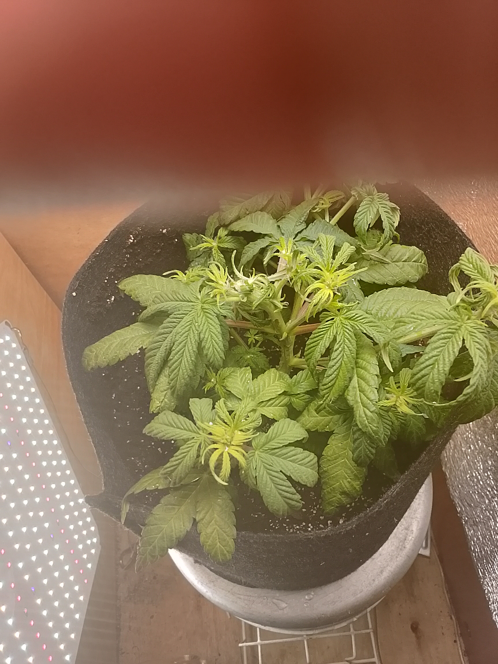 Убери. Он очень близко к растению ему плохо от этого. И с верху люстра наверно низко расположена. Он должен тянутся а ты его придавливаешь светом(