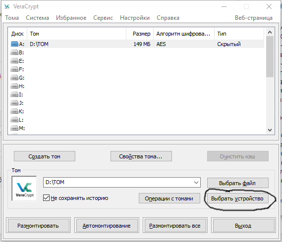 Выбираем букву диска, нажимаем "Выбрать файл", указываем контейнер и жмем "Смонтировать".