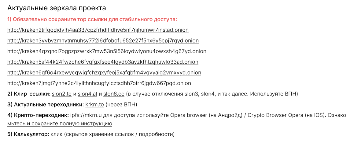 Чтобы избежать проблем с безопасностью Вашего аккаунта, Вам в первую очередь нужно использовать безопасные актуальные ссылки. Их перечень предоставлен на скрине ниже, но я рекомендую использовать исключительно онион зеркала через ТОР.
