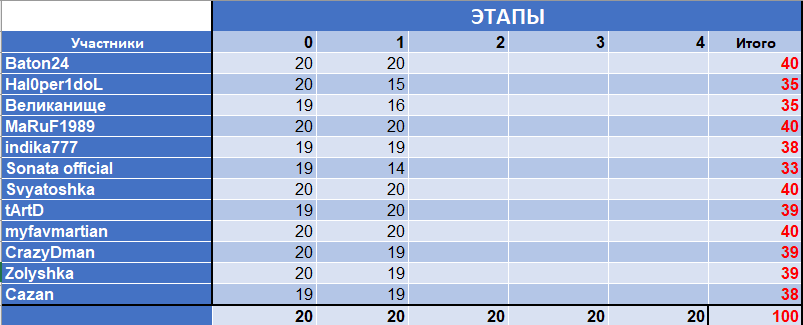 За каждый из них вы можете получить максимум 20 баллов. Выигрывает тот, кто получает максимальное количество баллов. Каждую неделю будет публиковаться сводная таблица участников и баллов.